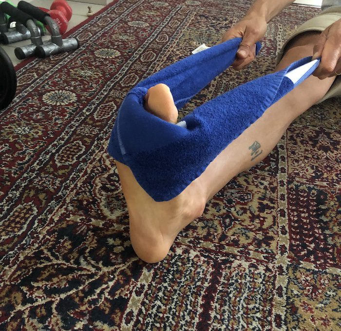 Some solutions: MTP (a deep transverse massage by rolling a tennis ball under the foot) in combination with an application of ice for 10 minutes 3 times a day. And a “homemade” technique that will cost you 10 euro cents and which allows you to do both at the same time: freeze a bottle of water and roll it under the arch of your foot 3×5 min per day! It is not necessarily the best miracle cure but if the fasciitis is not too established yet, it works quite well. At a more advanced stage, something else that gives good results: an exercise that consists of a simple increase of the heel. To begin, this can be done with both feet on the ground. Use a rolled towel to extend the toe upwards and stretch by an additional load at the fascia level. You can progress the exercise by doing it with one leg, and finally by doing it over the edge of a step. Another detail for this to work you must do it slowly: 3 sets of 10 or 15 once every two days (3 up, 3 down).