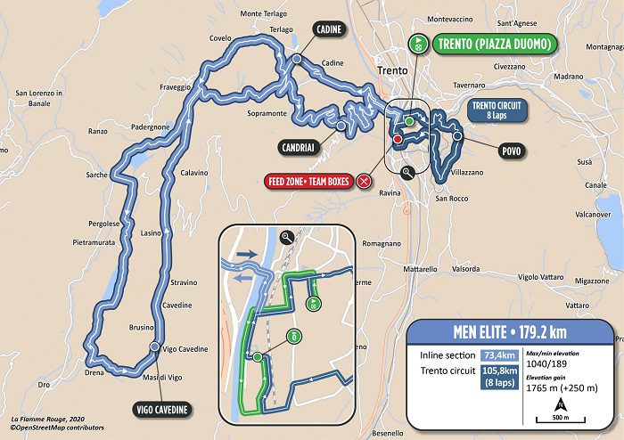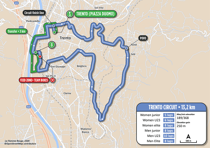 As for the road races, they all use a 13,2 km urban circuit with a 250 m elevation gain. The number of laps to be completed obviously varies according to the category, from 5 laps for the Junior women to 10 laps for the Espoir men. The Elite men will only do 8 laps of the circuit. But before that they will have completed a 73 km road course in the Monte Bondone region, which brings the total distance of the race to 179 km.