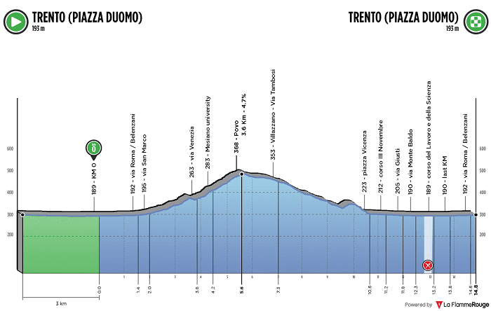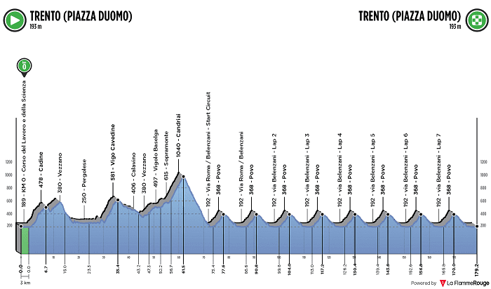 In terms of difficulty, while the first two kilometres are mainly flat, the main difficulty of the circuit is the climb of the Povo (3,6 km at 4,7%). The descent that follows takes the riders to Piazza Vicenza, then to the last 4 kilometres entirely flat in the streets of the city centre until the finish line.