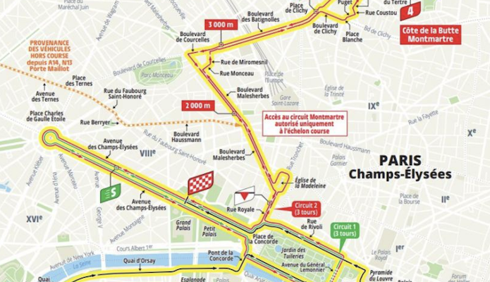 After starting in Mantes-la-Ville, the peloton will first complete three laps of the Champs-Élysées. The peloton will then change direction on the fourth lap, passing through Rue Lepic, with a 1,1-kilometer climb at a 5,9% gradient. The circuit will be 17 kilometers long, with the final summit just six kilometers from the finish.